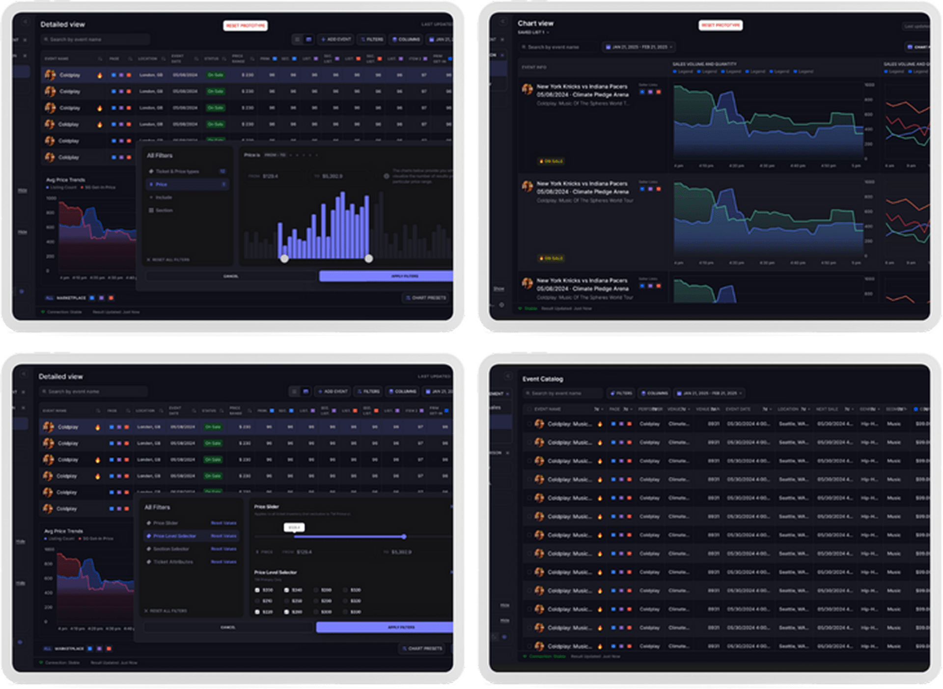 Valere conducted comprehensive user research with veteran ticket brokers managing $2.5M to $15M in annual sales volume to understand their workflows and pain points. The team performed a complete UX audit, developed user personas for different broker types, created a scalable design system with reusable components and patterns, redesigned dashboards for sold inventory tracking and pricing analytics, built wireframes and high-fidelity prototypes for new features, and collaborated on product roadmap prioritization based on user research findings. The solution brought structure to the product roadmap and gave the platform a design system that scales.