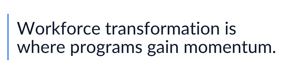 The workforce dimension of AI transformation is where most programs either gain momentum or quietly stall. Getting it right means treating skill-building and change management with the same rigor as the technical implementation. In our experience, most organizations do not prioritize this sufficiently on the first pass.