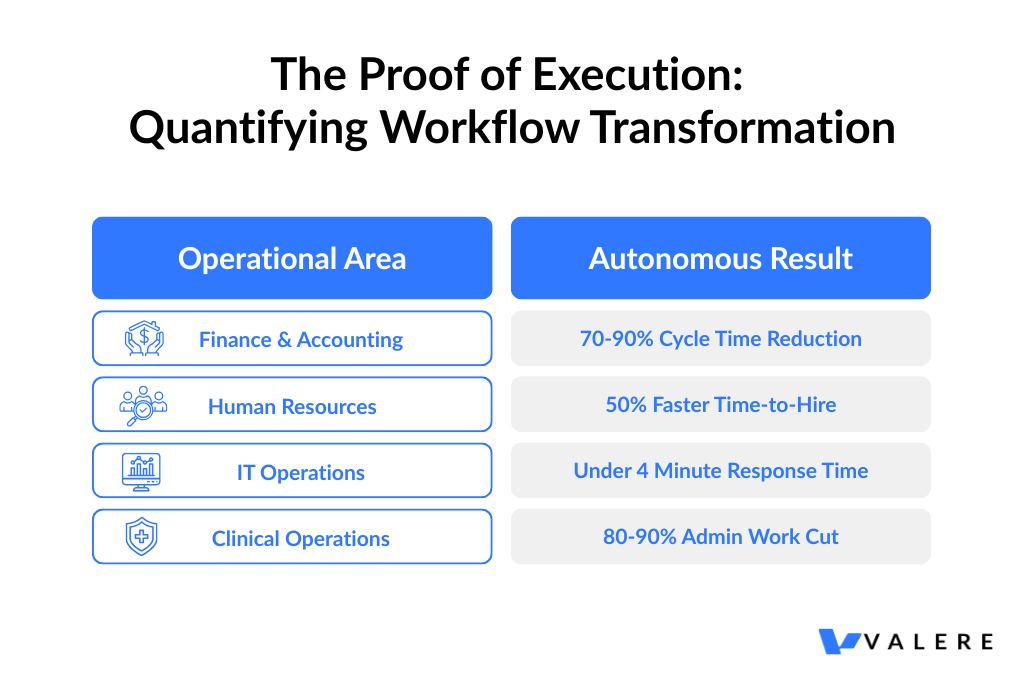Autonomous agents function as always-on, audit-ready process executors. A mid-market financial operations platform built to handle the full invoice management lifecycle autonomously illustrates what this looks like in practice. The platform reads, validates, and processes payments without a human in the chain. Businesses in this space routinely face costly bottlenecks from manual invoice processing. Invoices arrive through multiple channels, validation involves multiple people, and payment runs require sign-off at every stage. Replacing that with an end-to-end automated workflow means human involvement becomes the exception, applied only where genuine judgment is required. Across invoice processing deployments, these systems consistently deliver 70 to 90 percent reductions in cycle time.