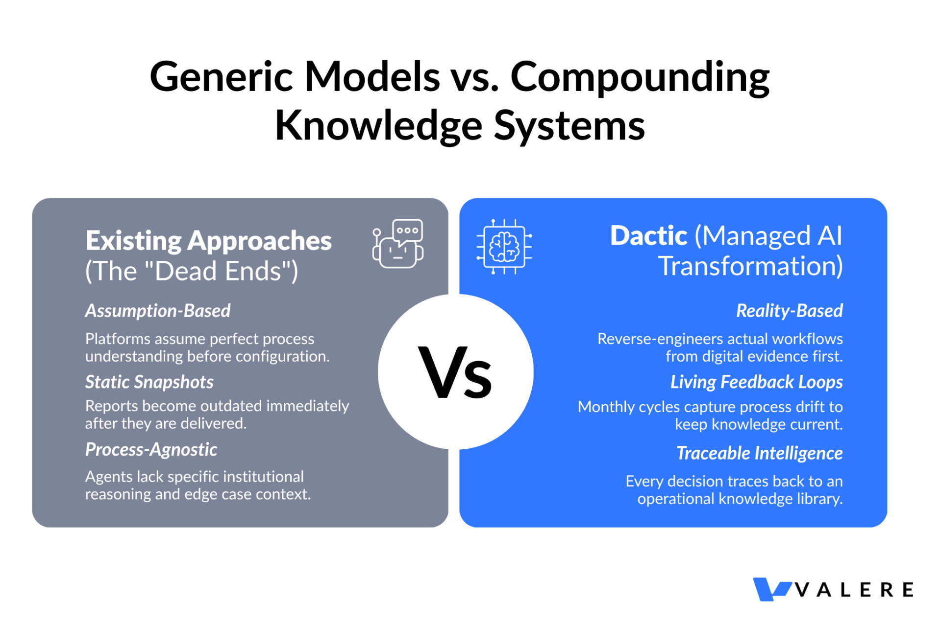 Dactic sits in the space none of these occupy. It functions as a managed AI transformation layer that bridges the discovery work of consulting, the automation capabilities of modern platforms, and the ongoing feedback loop that keeps the system current as the organization evolves. The agents Dactic deploys are traceable to a specific knowledge library built from your actual operations, which matters considerably for audit trails and organizational trust.