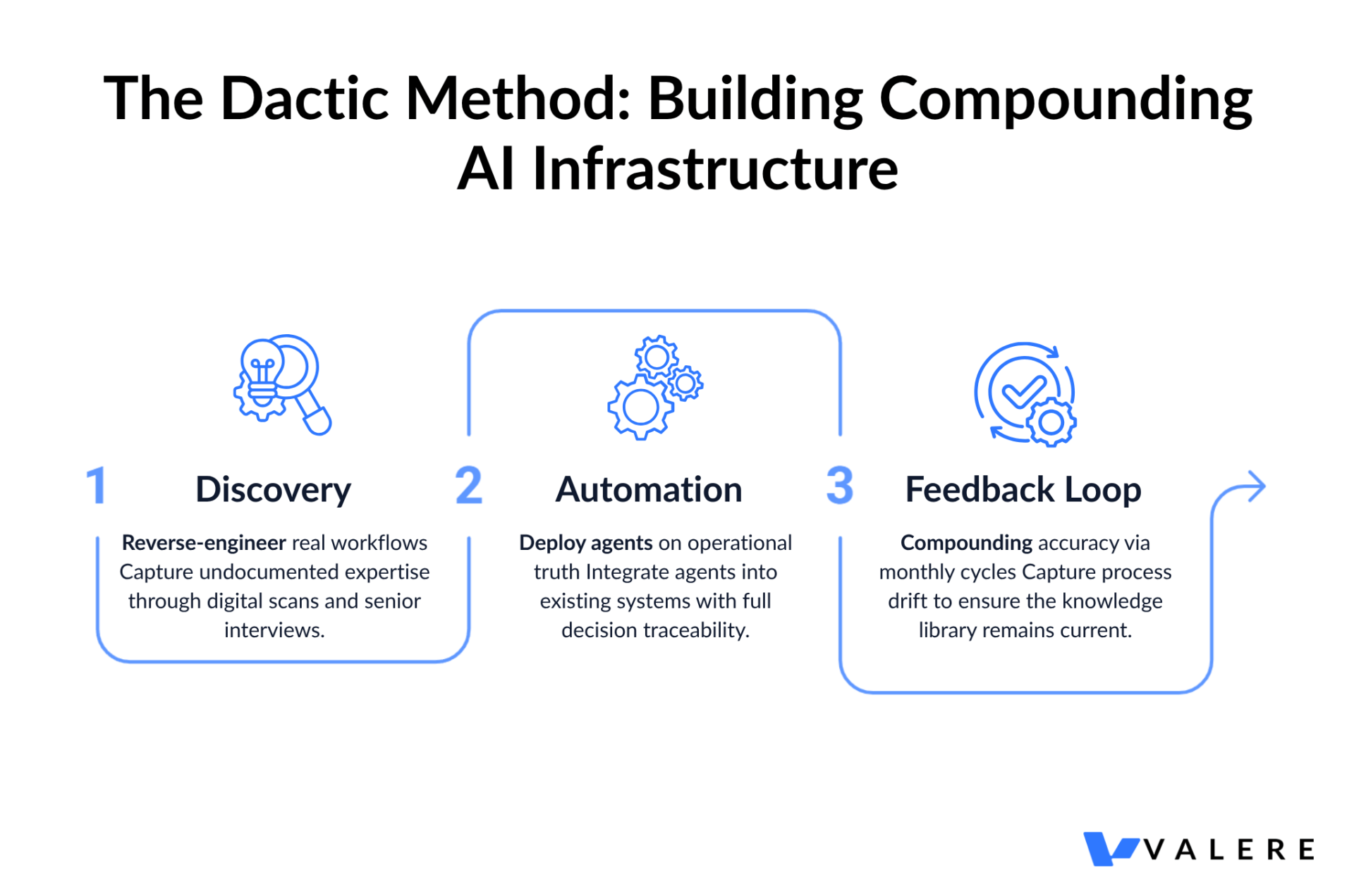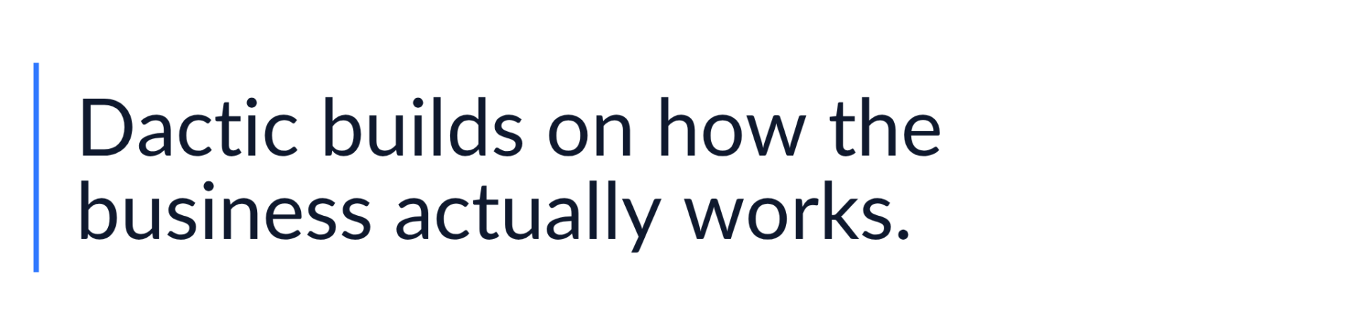 Dactic sells the foundation. The Discovery phase surfaces the real operating picture. The Automation phase builds on top of it. The feedback loop keeps it accurate. The result is an AI layer that reflects how the business actually works, not how it’s supposed to work.